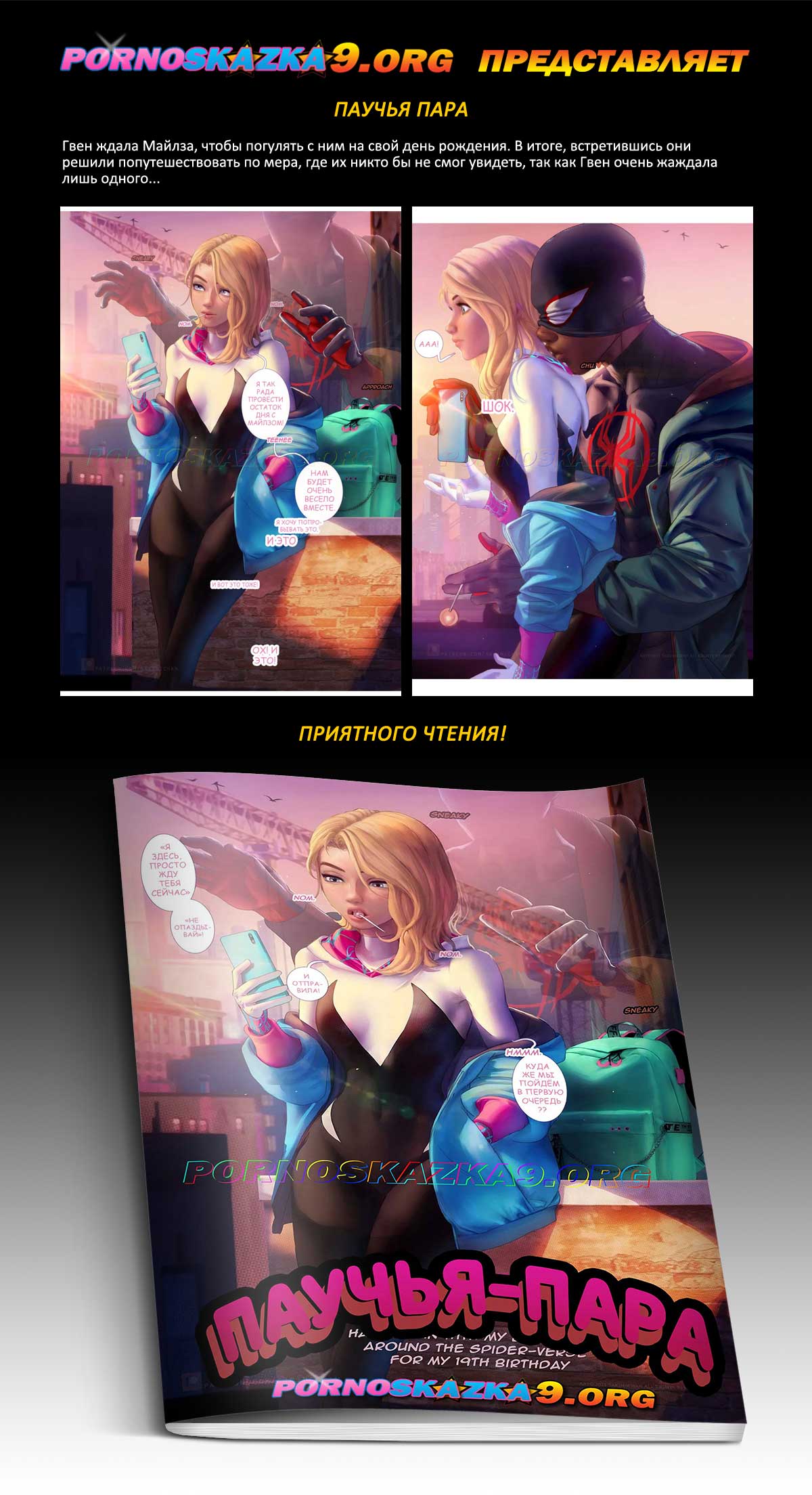 Порно комикс «Паучья пара.» Гвен ждала Майлза, чтобы погулять с ним на свой день рождения. В итоге, встретившись они решили попутешествовать по мирам, где их никто бы не смог увидеть, так как Гвен очень жаждала лишь одного…